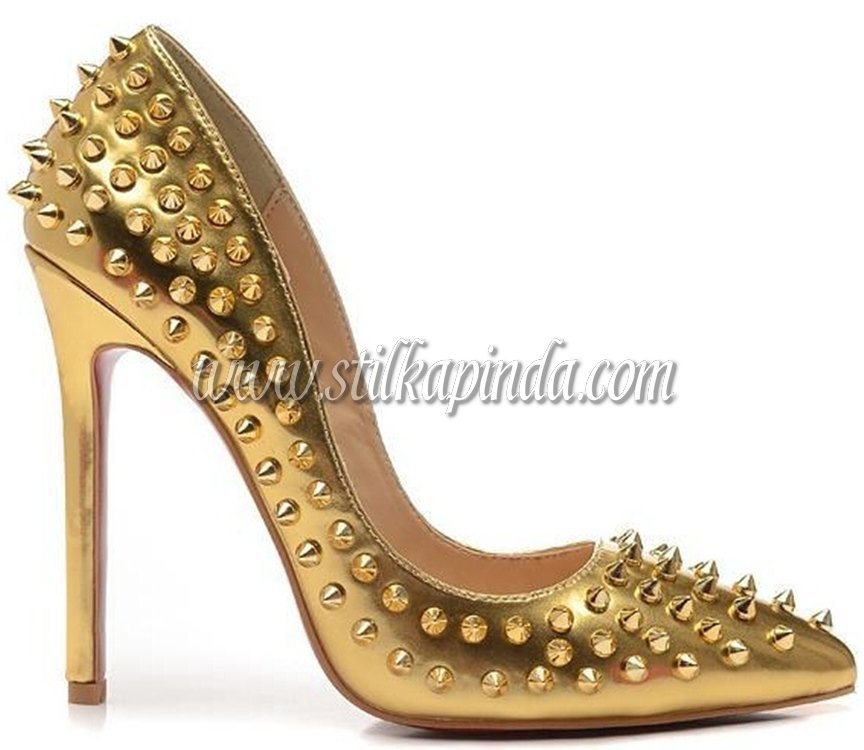 altın rengi yüksek topuk rugan zımbalı stiletto