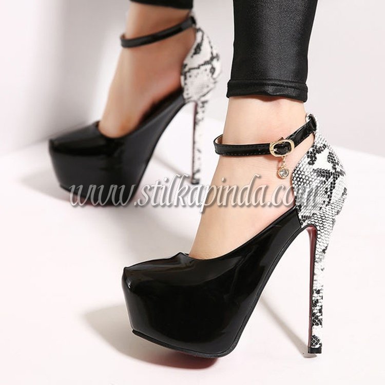 yılan derisi siyah rugan bantlı yüksek topuk platform