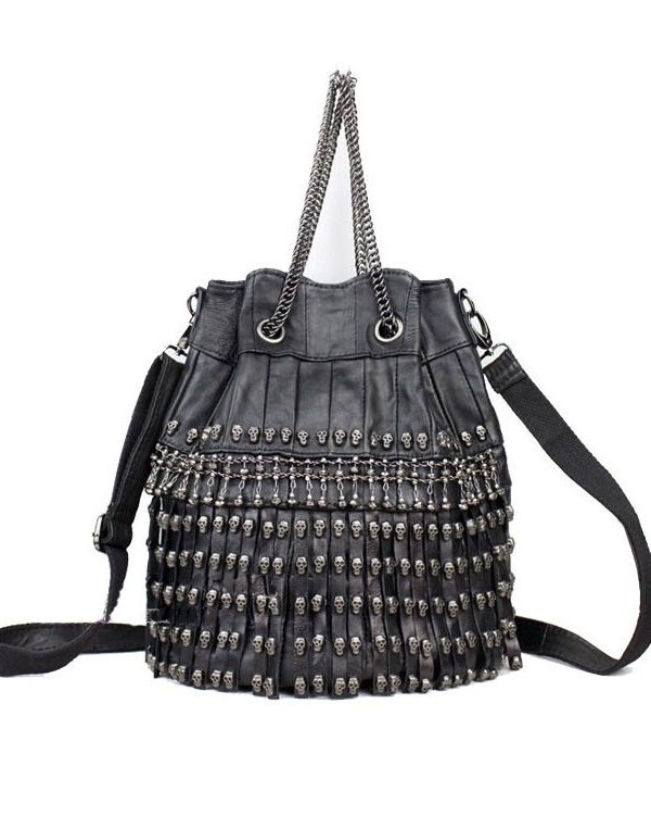 Yumuşak, hakiki deriden üretilmiştir. 31x33 cm ebatındadır. Zincirli büzgülüdür. Ön kısmı kuru kafa işlemelerle süslenmiştir. Deri omuz askısına sahiptir. Omuz ve kol çantası olarak kullanıma uygundur. Siyah renk olarak sipariş verebilirsiniz.