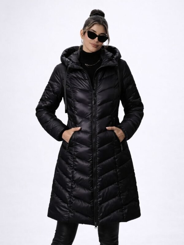 A practical long hooded puffer jacket for women designed to keep you warm and comfortable during cold winter days. Ideal for everyday use.