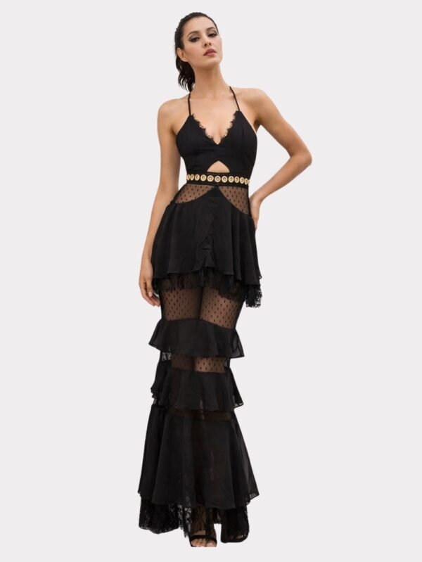 Elegant romance with refined detail. This lace ruffle evening dress features delicate spaghetti straps and a fitted waist silhouette for sophisticated formal occasions.