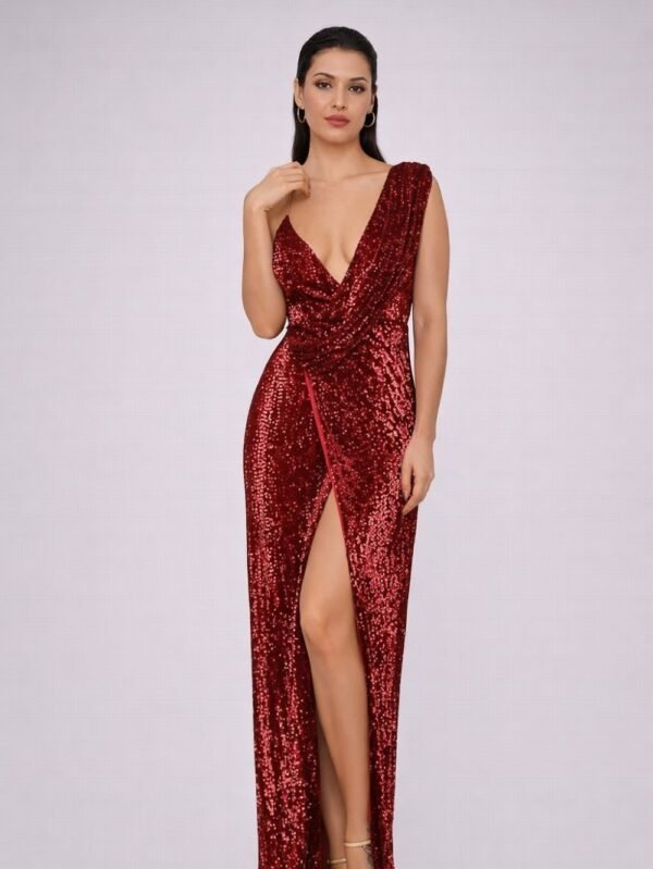Radiant glamour with modern elegance. This one shoulder sequin evening dress features a dramatic slit and fitted waist silhouette for standout formal occasions.