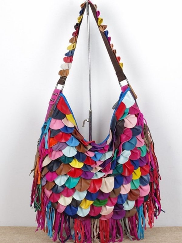 Hakiki İnek derisinden üretilmiştir. Kol çantası 43x33x6 cm ebatındadır. Çanta büyük boy olup omuz çantası olarak tasarlanmıştır. Patchwork püskül detaylara sahiptir. Çok renkli ve Siyah renk seçeneği ile sipariş verebilirsiniz.