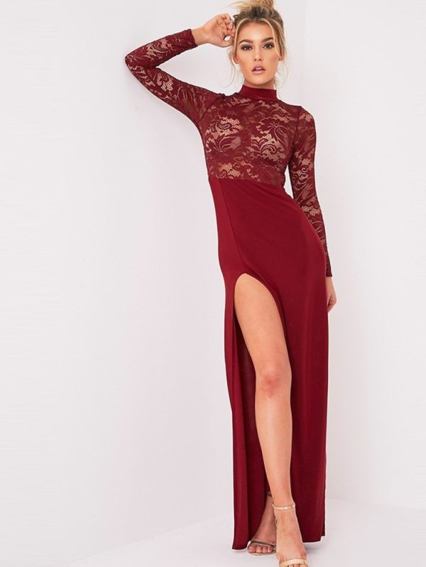 Bahar aylarında, gece davet ve organizasyonlarda şık bir görünüm elde edebileceğiniz, %100 pamuk kumaştan üretilmiş, üst kısmı dantel, uzun kol ve boğazlı yaka olarak tasarlanmış, size şıklık katacak tasarıma sahip, dar kesim, önden yırtmaçlı maksi elbise. Bordo rengi mevcuttur. XS,S,M,L ve XL beden seçenekleri ile sipariş verebilirsiniz.