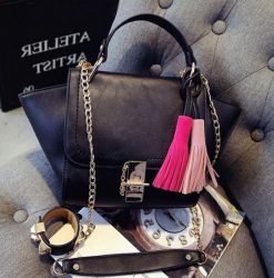 püsküllü trapeze zincirli siyah kol çantası sk10305