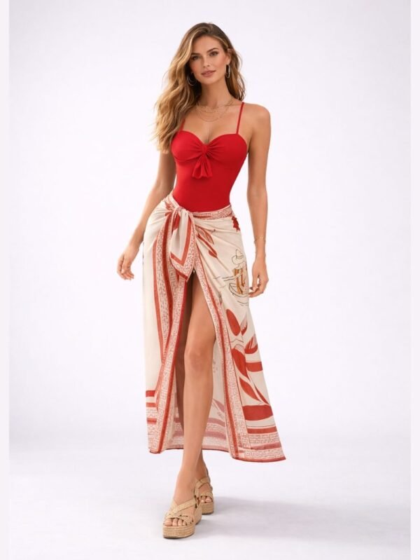 Stylish red patterned skirted swimsuit set designed to offer a feminine, comfortable, and elegant summer beach look.