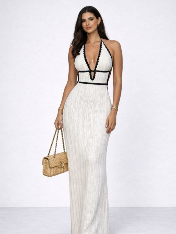 Elegant white knitted dress featuring a bold open-back design, offering a refined and lightweight look for summer occasions.