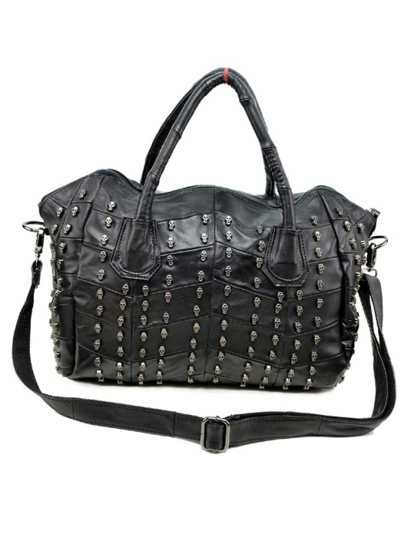 Hakiki yumuşak deriden üretilmiştir. 40x31 cm ebatındadır. Ön kısmı kuru kafa detaylı, alt kısmı zımba süslemelidir. Omuz ve kol çantası olarak kullanıma uygundur. Siyah renk olarak sipariş verebilirsiniz.