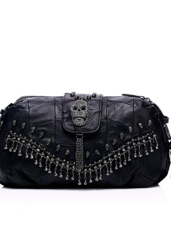 Yumuşak, hakiki deriden üretilmiştir. 31x33 cm ebatındadır. Zincirli büzgülüdür. Ön kısmı kuru kafa işlemelerle süslenmiştir. Deri omuz askısına sahiptir. Omuz ve kol çantası olarak kullanıma uygundur. Siyah renk olarak sipariş verebilirsiniz.