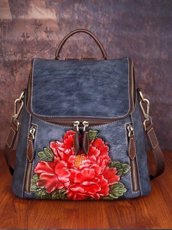 Çiçek Desenli Kabartma Gerçek Deri Sırt Çantası