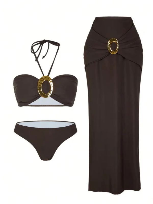 Polyester,Spandex üretilmiştir. Modern ve iddialı bir görünüm için tasarlanan bu kahverengi bikini etek takımı, metal aksesuar detaylarıyla fark yaratır. Plaj şıklığını zirveye taşıyan bu takım, hem rahat hem de göz alıcı bir stil sunar. Yaz tatilleri, havuz başı partiler ve plaj yürüyüşleri için idealdir. Kahverengi rengi mevcuttur. S,M,L ve XL beden seçenekleri ile sipariş verebilirsiniz.