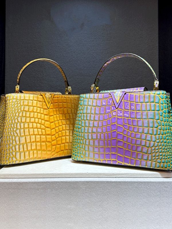 Yüksek kalite gerçek deriden üretilmiştir. Çanta 25×18×8 cm ebatındadır. Çanta orta boy olup omuz ve kol çantası olarak tasarlanmıştır. Çanta parlak timsah derisi desen detaylıdır. Mor ve Sarı renk seçeneği ile sipariş verebilirsiniz.