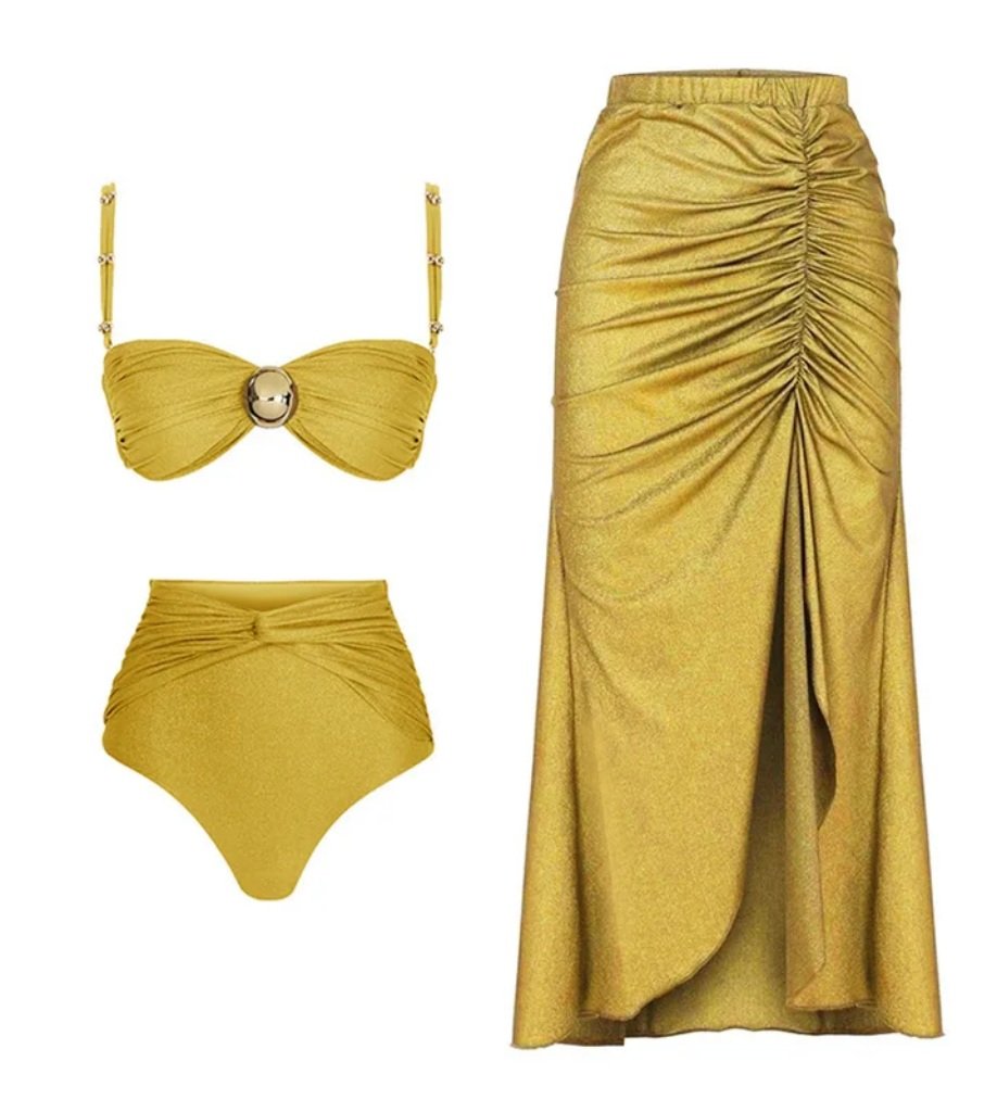 The Gold High-Waist 3-Piece Accessory Bikini Set for Women is designed for women who want an elegant, confident, and luxury-inspired beach look. Produced from a polyester, nylon, and spandex blend, the fabric provides flexibility, comfort, and a smooth fit that adapts to body movement.