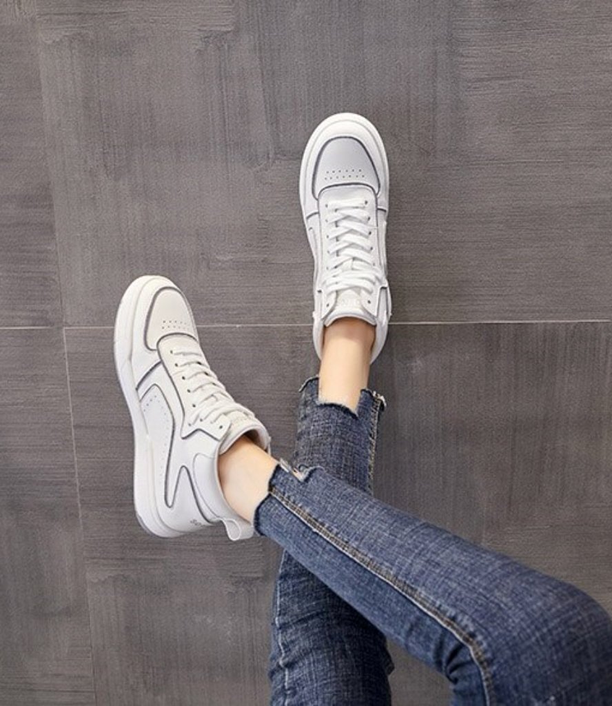 Designed with modern line detailing, these white leather sneakers offer a minimalist silhouette suitable for daily wear. Their versatile look pairs effortlessly with denim, dresses, tailored trousers, and casual outfits.
