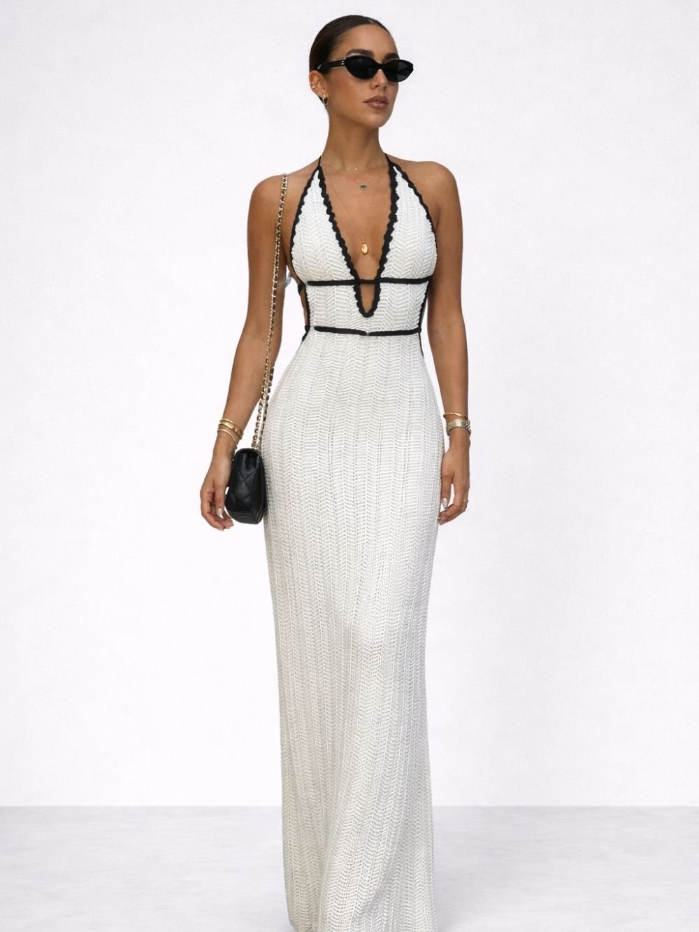This white knitted backless dress for women is crafted from a cotton and polyester blend knitted yarn, providing a soft texture and breathable comfort. The elegant knit pattern adds visual depth, while the bold open-back design creates a confident and feminine silhouette.