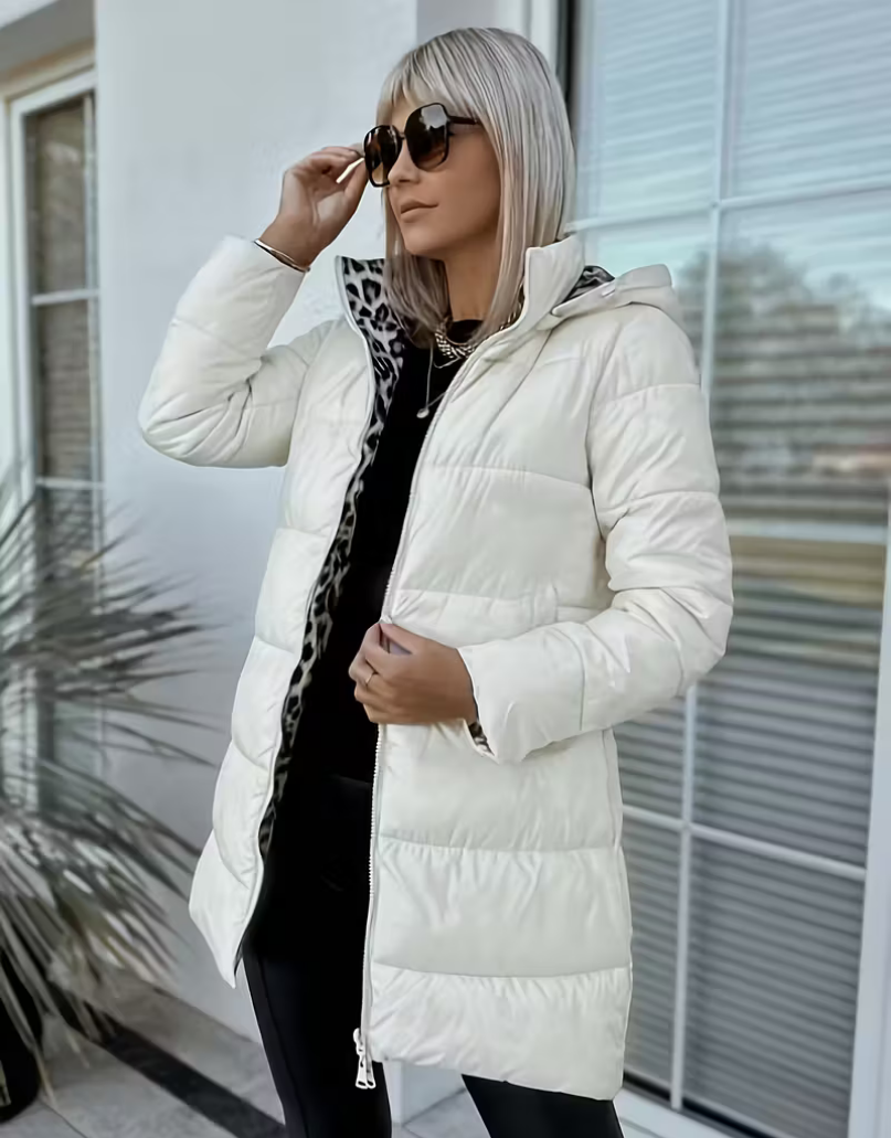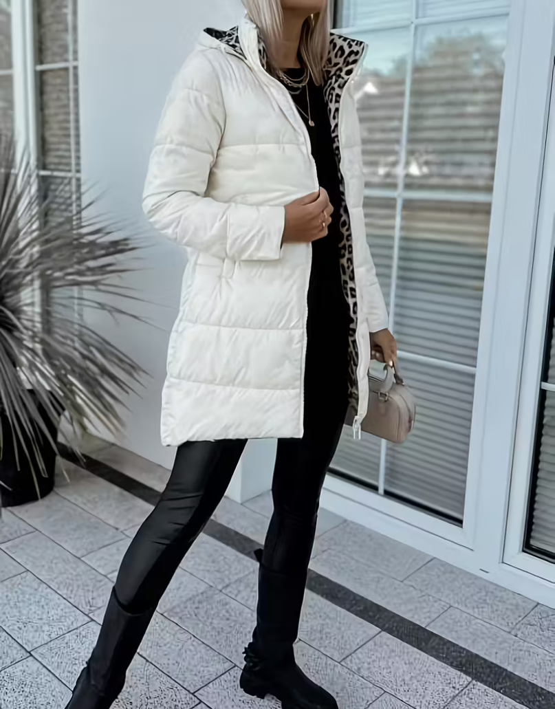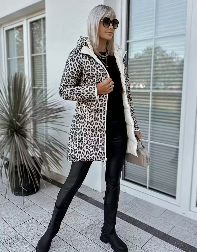 Cesur leopar deseni ile sade şıklığı bir araya getiren Çift Taraflı Leopar Şişme Mont, iki farklı tarzı tek üründe sunar.