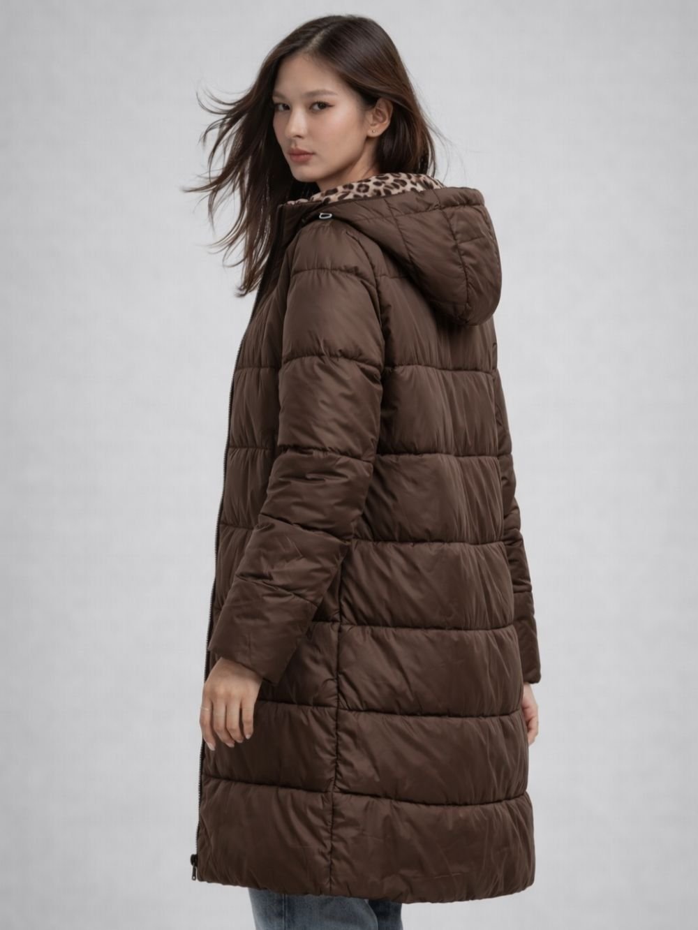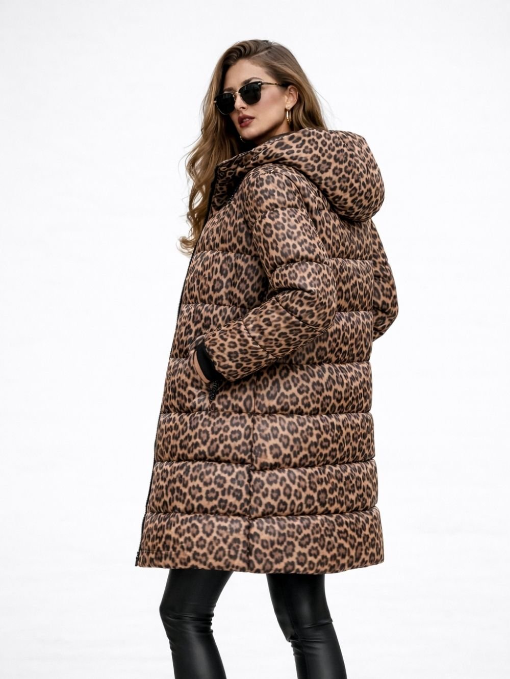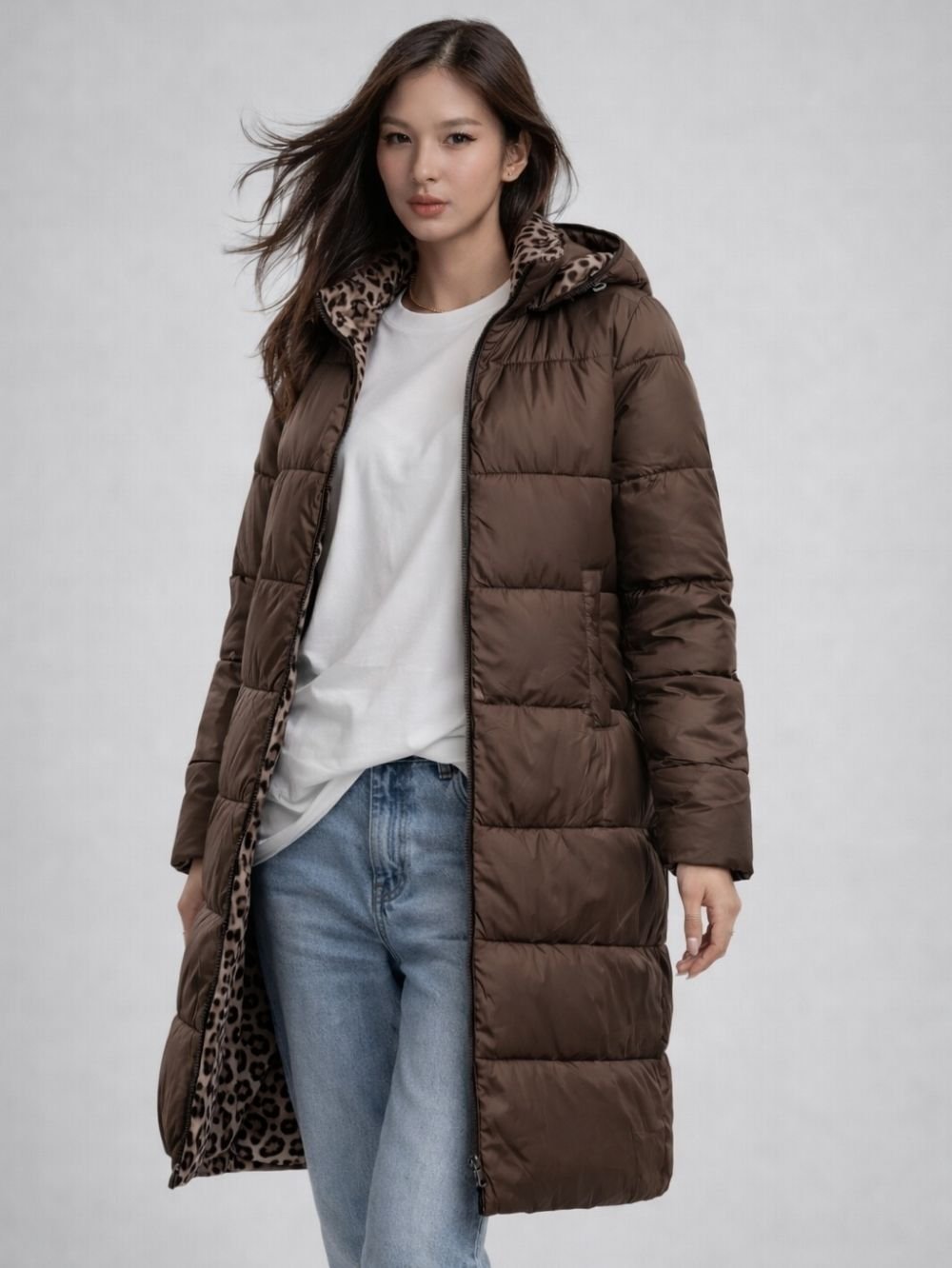 This reversible leopard puffer jacket for women is designed for versatility and comfort during cold weather. The double-sided design allows you to switch between a bold leopard look and a more classic style, making it easy to match different outfits.