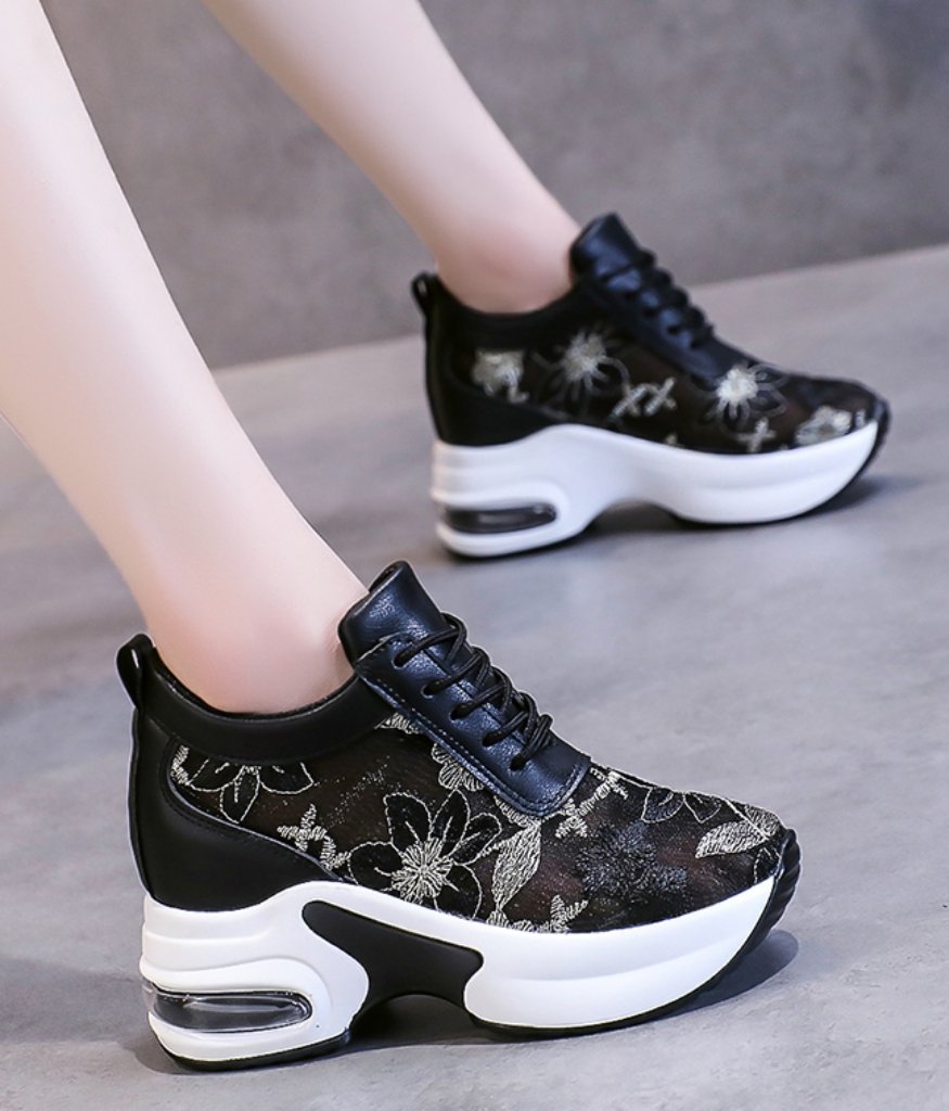 The SK52238 lace embroidered platform sneakers combine visible elevation, decorative texture, and structured comfort for women seeking expressive everyday footwear.