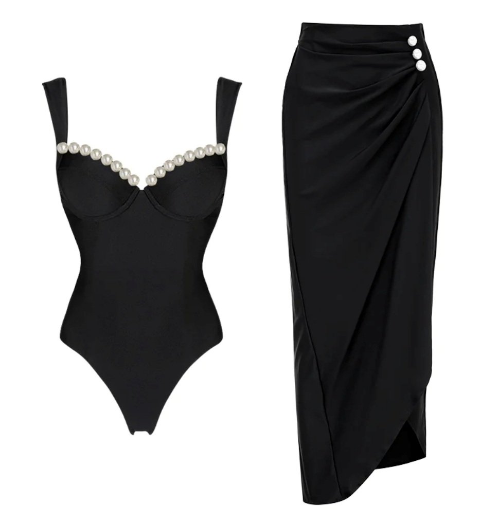 This two-piece swimsuit and skirt set features thick shoulder straps for support and decorative pearl bead accents that elevate the design beyond standard swimwear. The skirted structure provides additional coverage while maintaining a feminine and stylish silhouette.