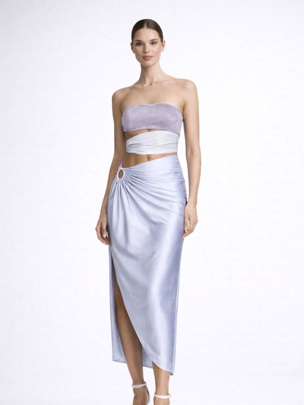 This two-piece mayokini and skirt set features a cut-out body design that highlights the silhouette while maintaining balance with its skirted structure. The string strap construction allows adjustable fit, while the add a refined, luxury-inspired touch.