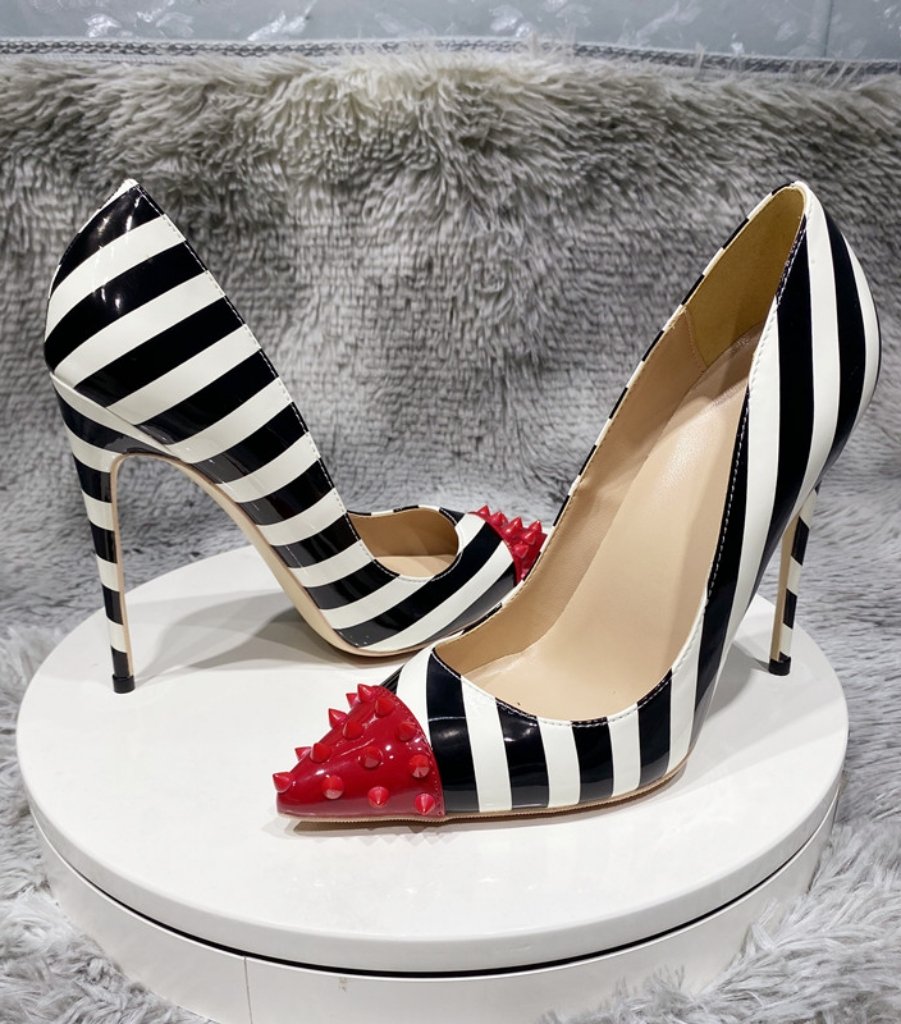 Featuring a standout red toe accent, combined with black and white color blocking, stud embellishments, and patterned detailing, this design delivers a confident and modern aesthetic. Available in 8 cm, 10 cm, and 12 cm heel heights, allowing you to choose the level of elegance and comfort that suits your style.