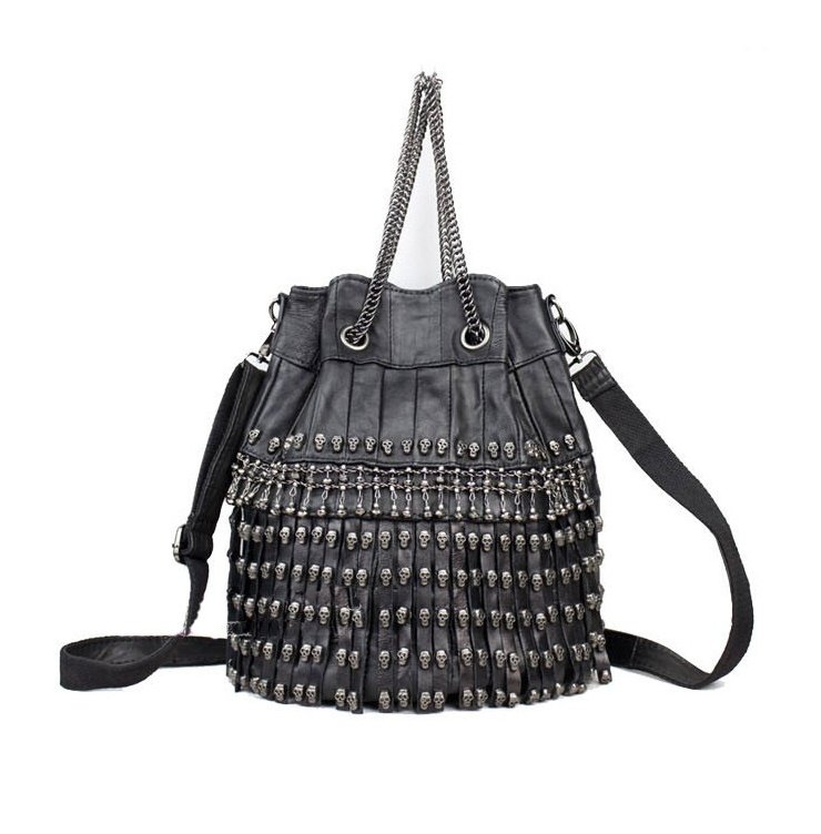 Yumuşak, hakiki deriden üretilmiştir. 31×33 cm ebatındadır. Zincirli büzgülüdür. Ön kısmı kuru kafa işlemelerle süslenmiştir. Deri omuz askısına sahiptir. Omuz ve kol çantası olarak kullanıma uygundur. Siyah renk olarak sipariş verebilirsiniz.