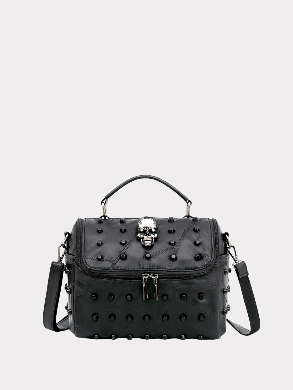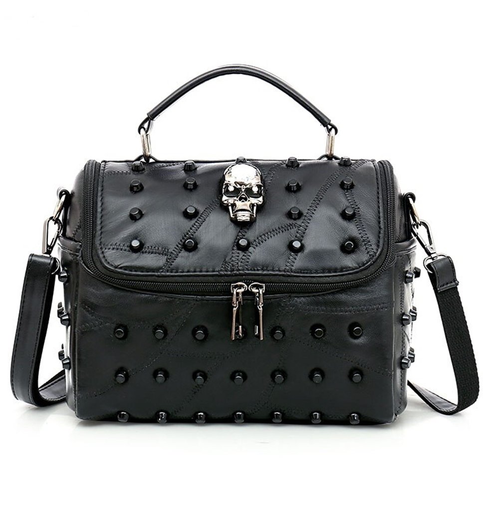 The bag features distinctive skull and stud embellishments that create a strong punk-inspired aesthetic. These decorative elements transform the classic leather handbag into a statement accessory perfect for modern street fashion and edgy styling.