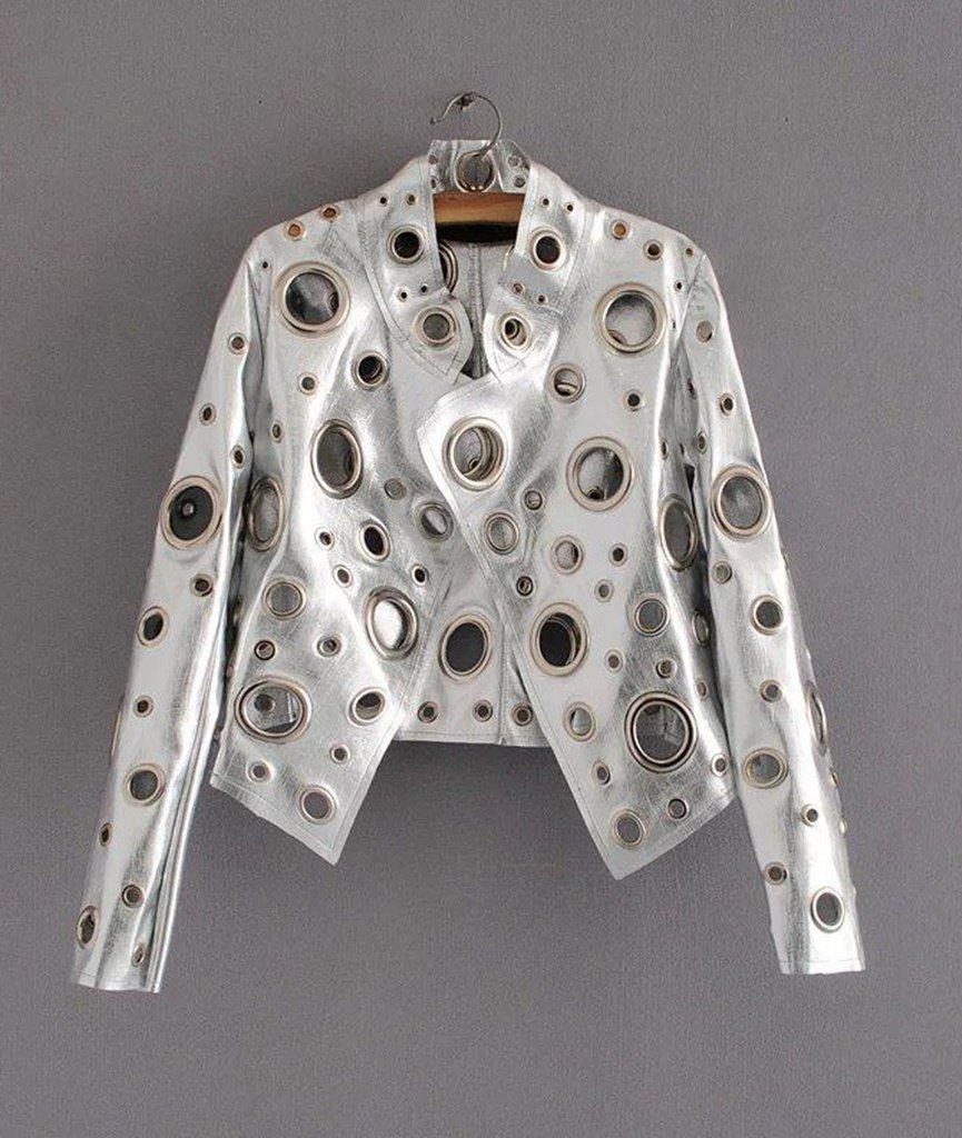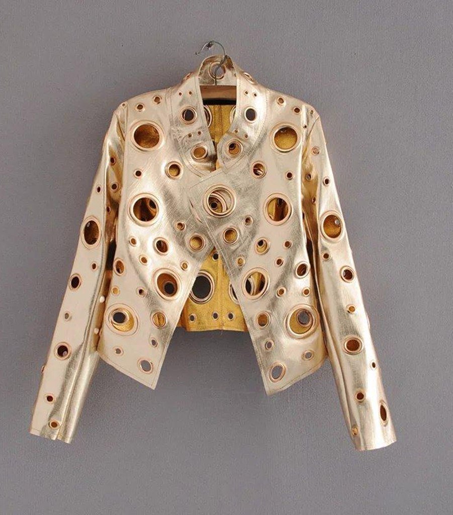 Yüksek kalite suni deriden üretilmiştir.Deri ceketin üzerinde kuş gözü metal detaylar kullanılmıştır. Kapama şekli yoktur önü açık olarak tasarlanmıştır. Siyah, Altın ve Gümüş rengi mevcuttur. S,M,L ve XL beden olarak sipariş verebilirsiniz.