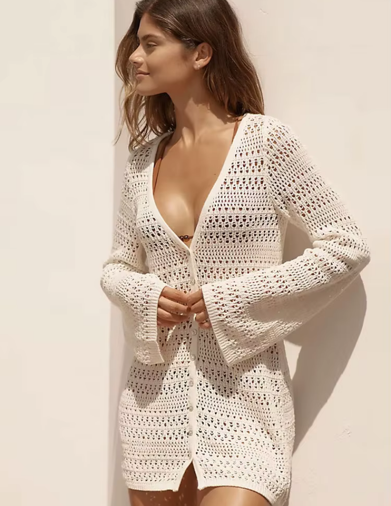 Designed as a mini knitted beach dress, this model can be worn comfortably over bikinis and swimsuits during summer holidays. The knitted fabric structure provides airflow, while the short length makes it suitable for quick layering after swimming.