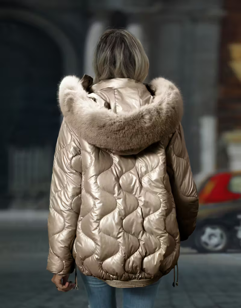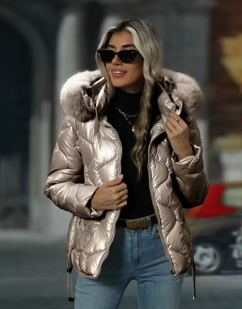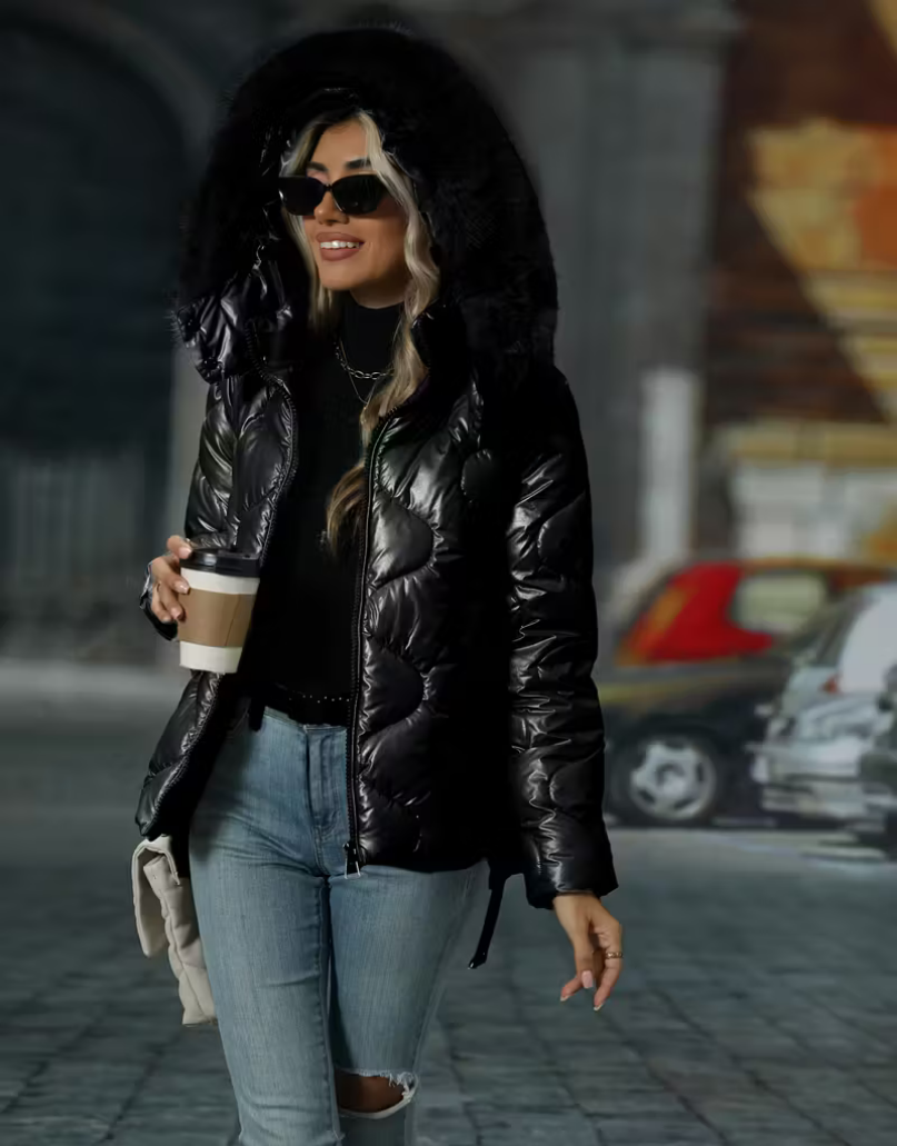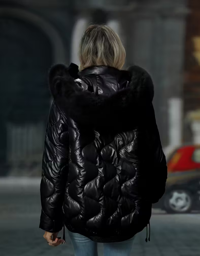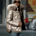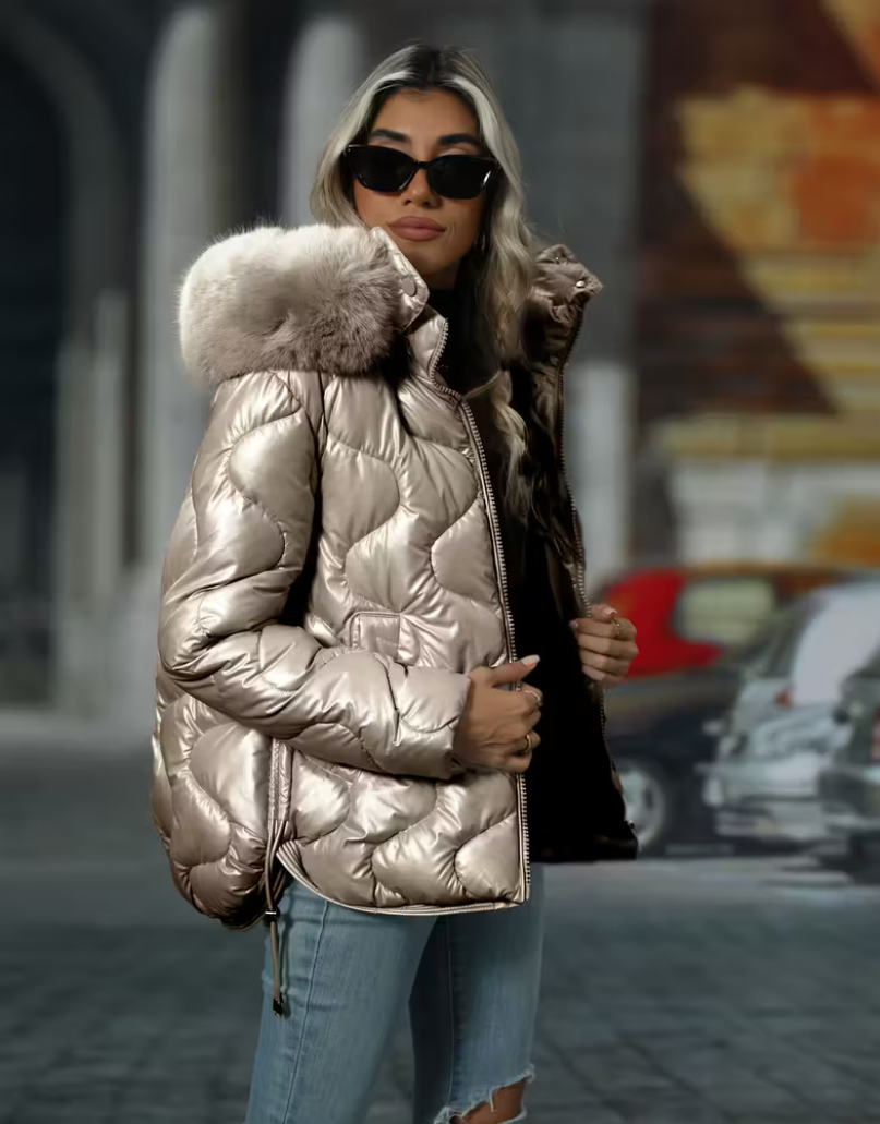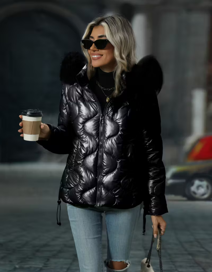 Kış aylarında hem sıcak hem de stil sahibi görünmek isteyen kadınlar için tasarlanan Parlak Kürk Kapüşonlu Şişme Mont, modern dokusu ve gösterişli detaylarıyla dikkat çekiyor.