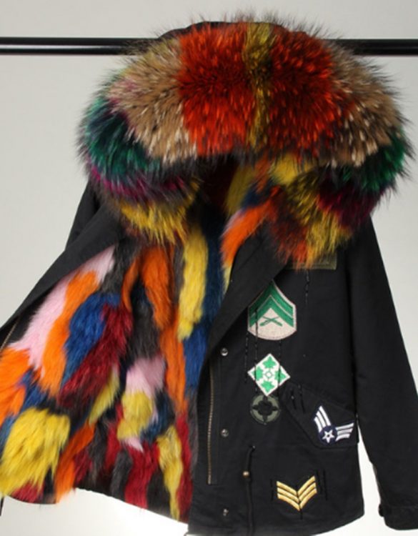 siyah rakun kürk renkli kapüşonlu parka sk25962