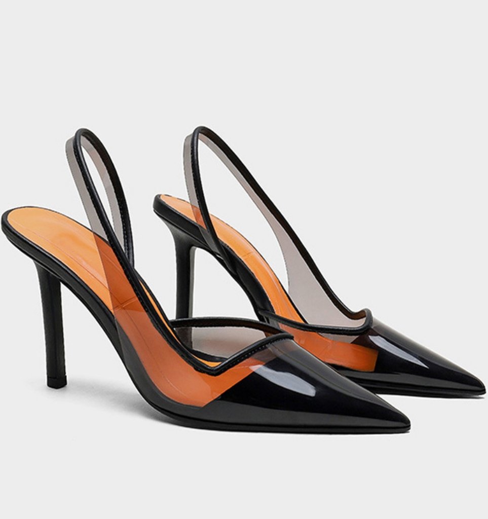 Unlike fully transparent strap heels, this design focuses on the clear heel element, creating a balanced combination of bold and sophisticated. The durable rubber outsole improves grip and stability, supporting confident movement despite the slim heel profile.