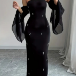 Straplez siyah incili uzun elbise, her gardıropta bulunması gereken zamansız bir parçadır. Hem klasik hem de gösterişli çizgileriyle, göz alıcı ve şık bir akşam stili için ideal seçimdir.
