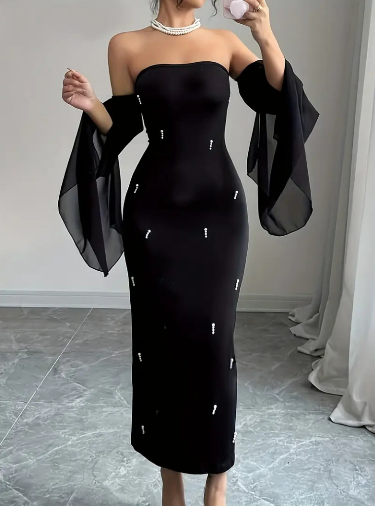 Strapless Black Pearl Detail Long Dress for Women