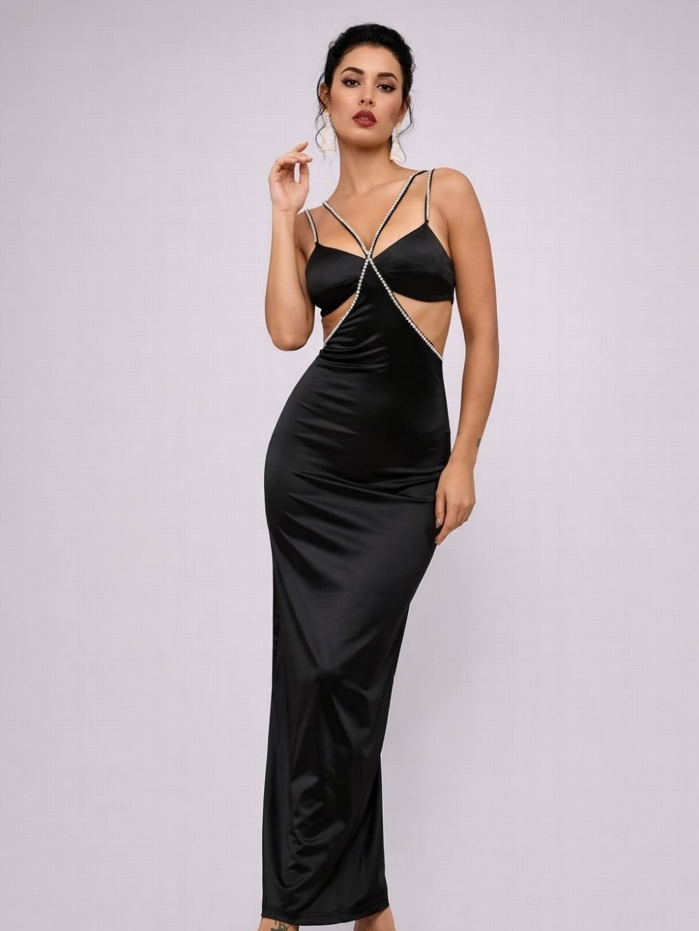 A back zipper closure ensures easy wear and maintains the smooth silhouette of the dress.