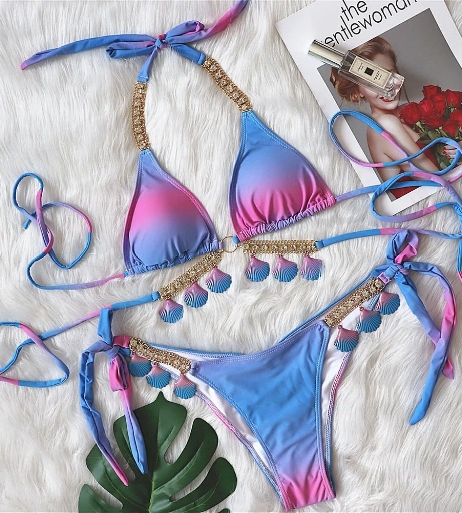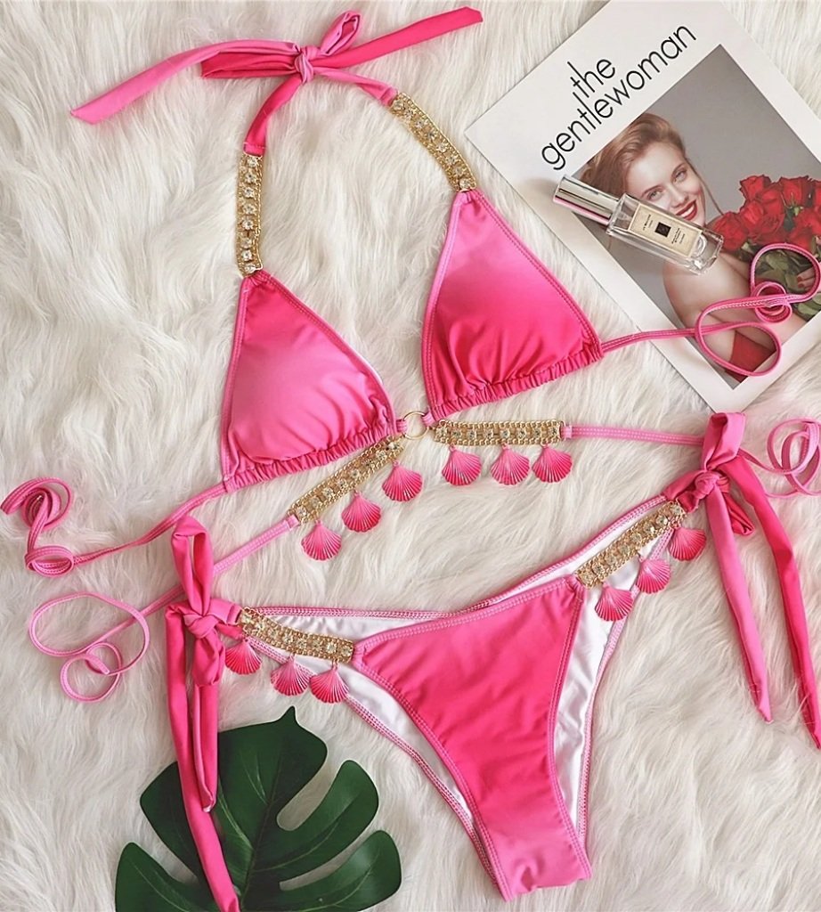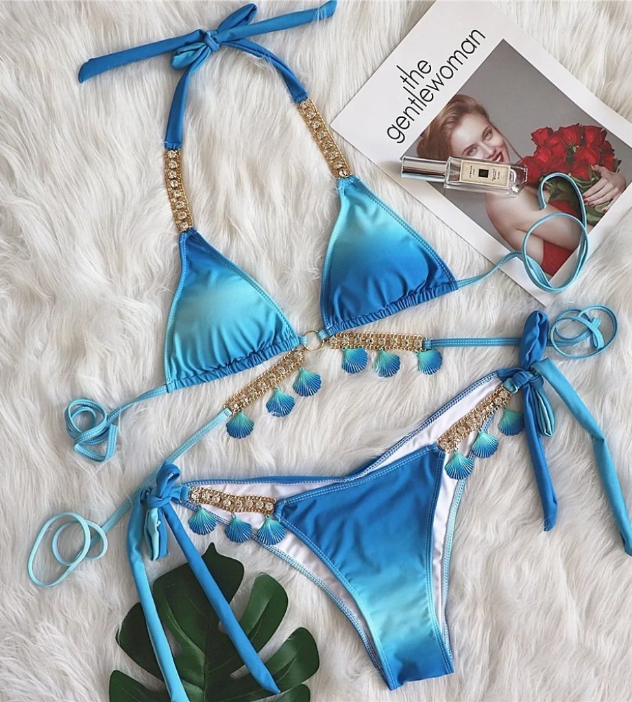 This bikini set features a halter neck tie design, allowing adjustable support and a customizable fit. The stone and seashell accessory details add a distinctive coastal character, making this model ideal for beach vacations, summer holidays, and resort wear.