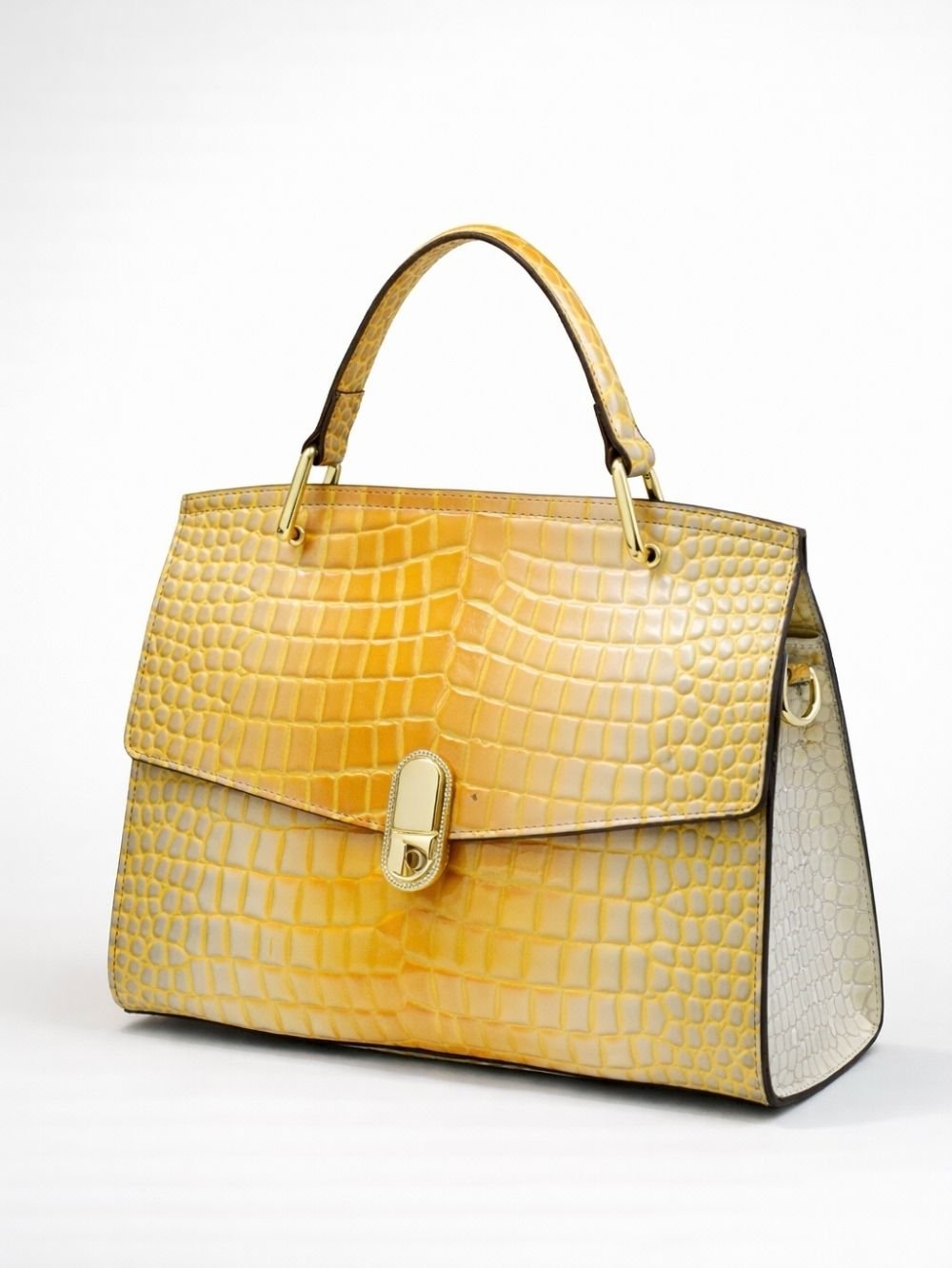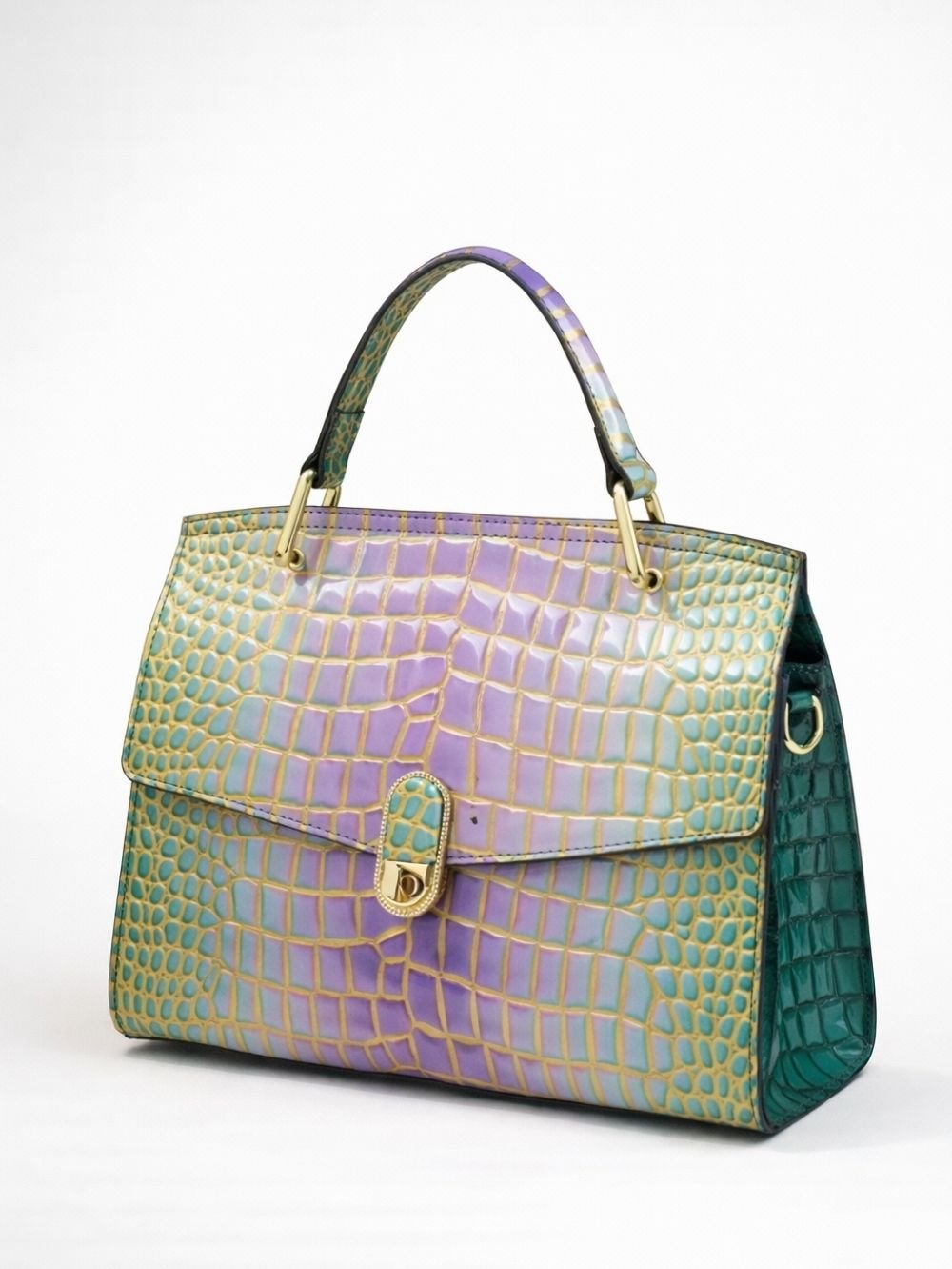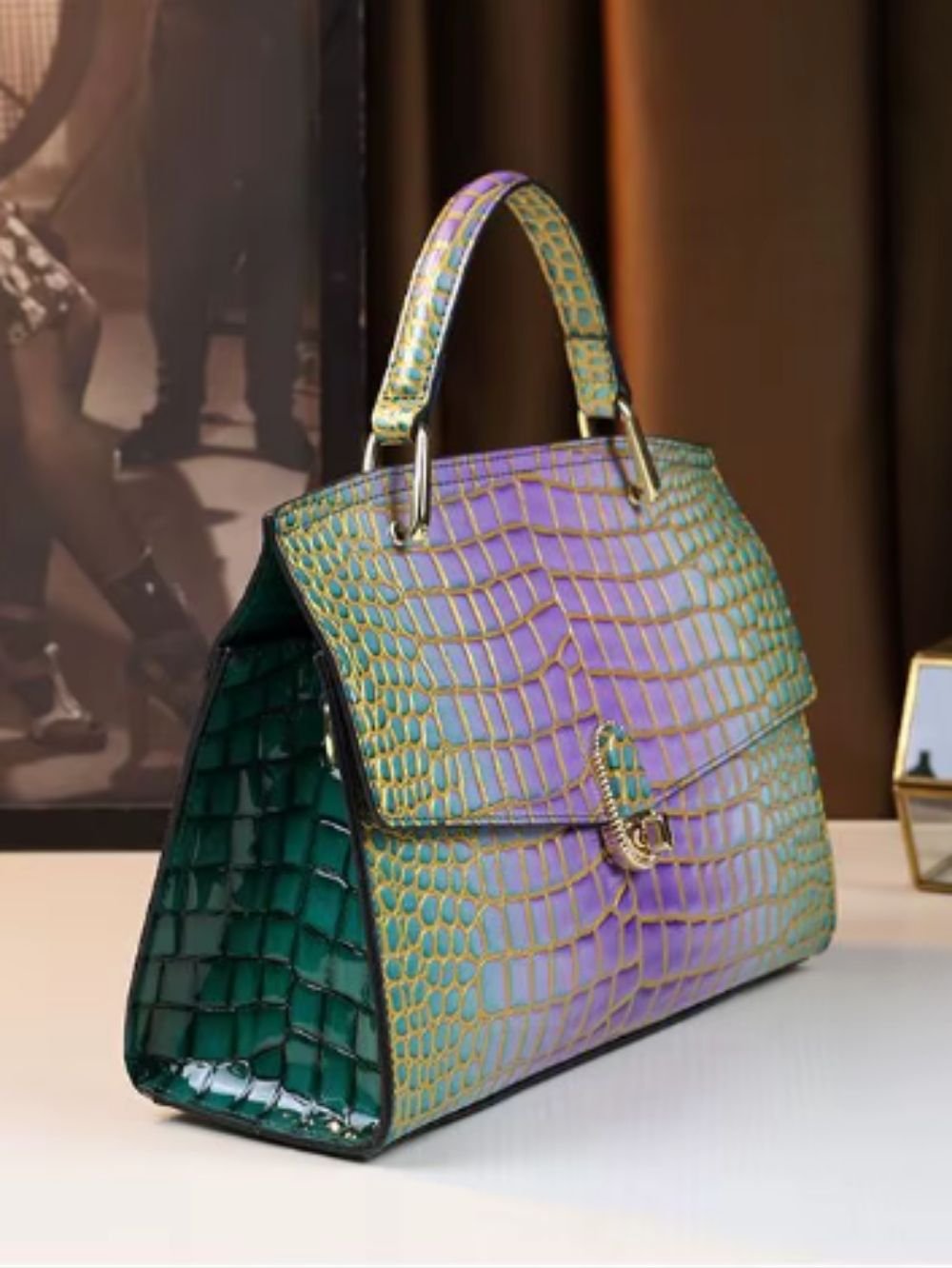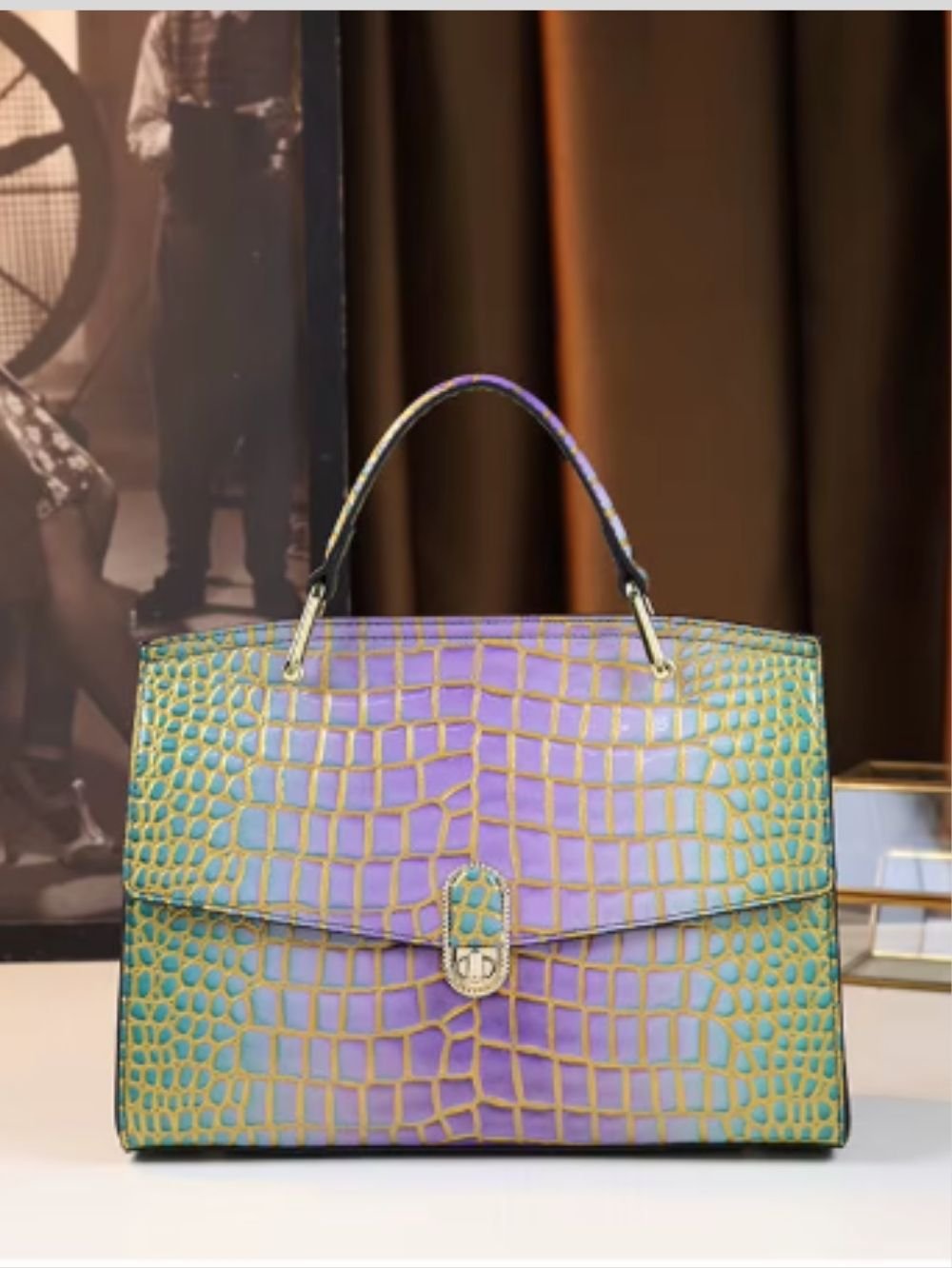 Available in purple and yellow, this croc-embossed leather bag adds a distinctive touch to modern wardrobes.