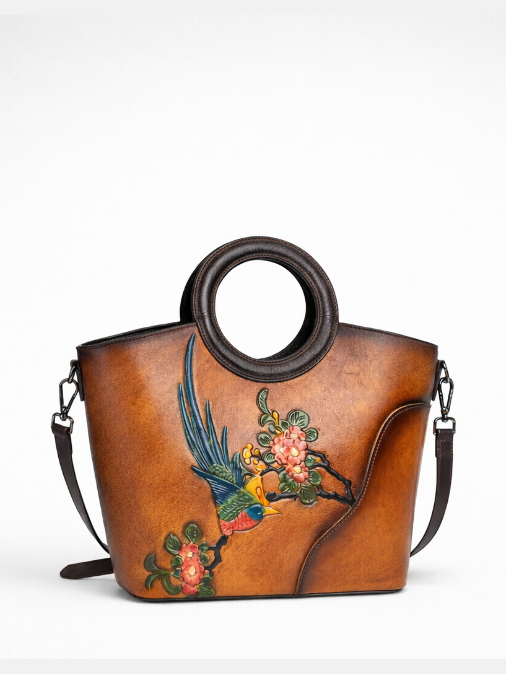 Crafted from high-quality genuine leather, this handbag features hand-embossed floral and bird detailing, creating a distinctive vintage aesthetic. Each piece is handmade, offering texture, depth, and individuality while maintaining durability and structure.