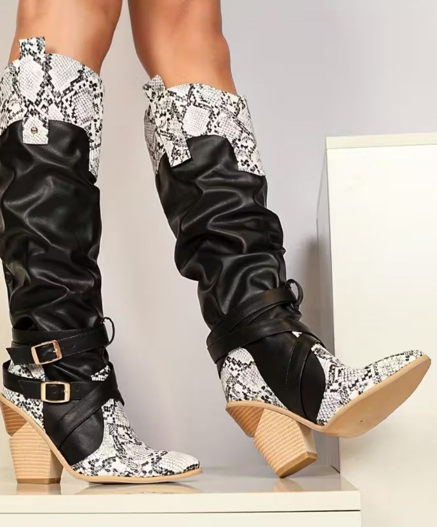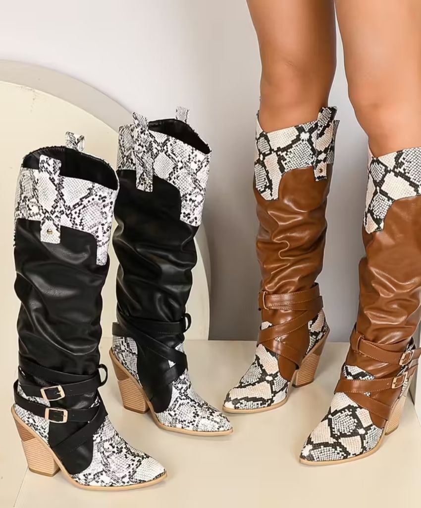 Yılan Derisi Desenli Uzun Çizme, özgün dokusu ve iddialı tasarımıyla dikkat çekiyor.