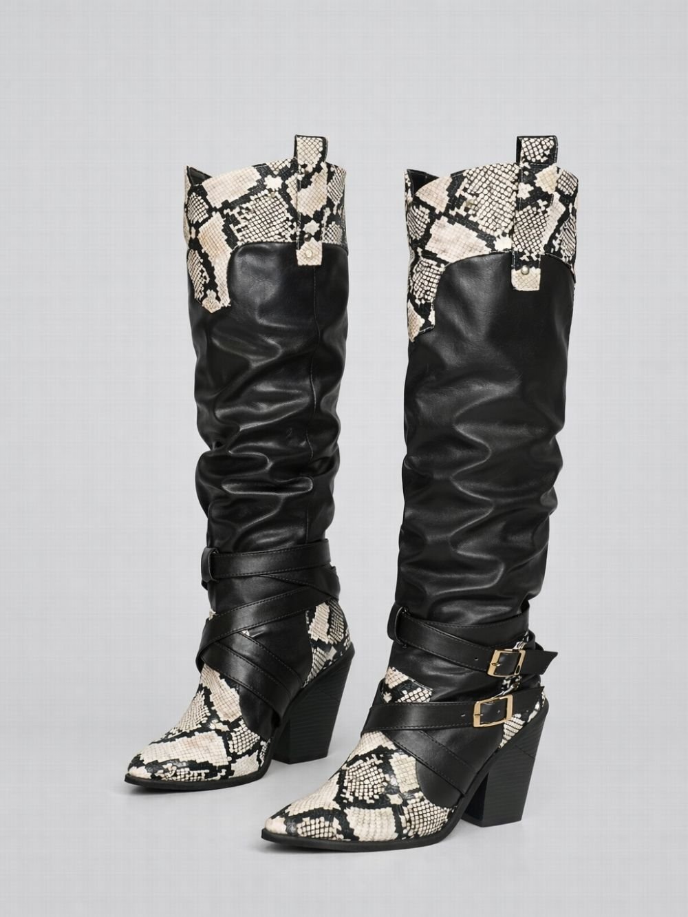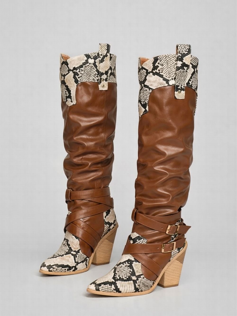 These snake print knee-high boots for women combine a striking pattern with a clean, elongated silhouette. The knee-high design enhances leg length while offering a confident, modern style.