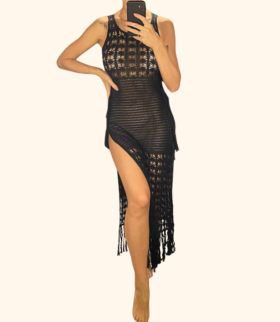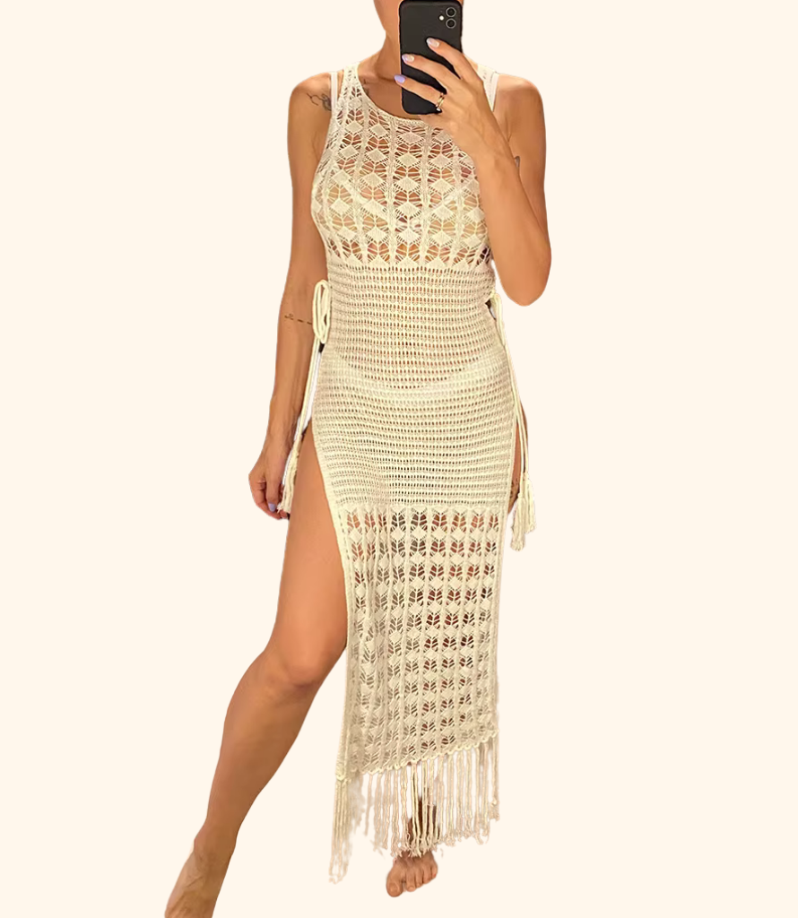 Side slit knitted beach dress for women made from cotton polyester blend, designed to be worn over bikinis and swimsuits in summer.
