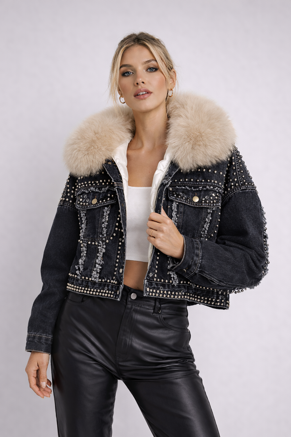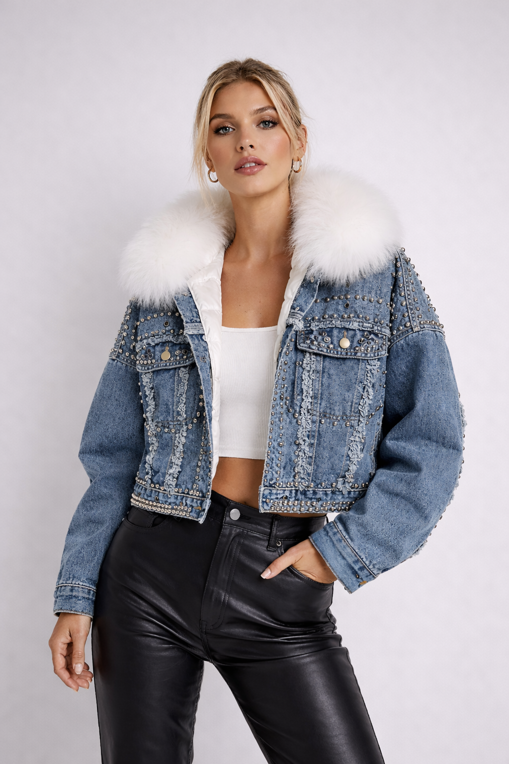 The SK50705 studded denim jacket combines classic denim structure, luxurious fur detail, and edgy metal accents for women seeking modern statement outerwear.